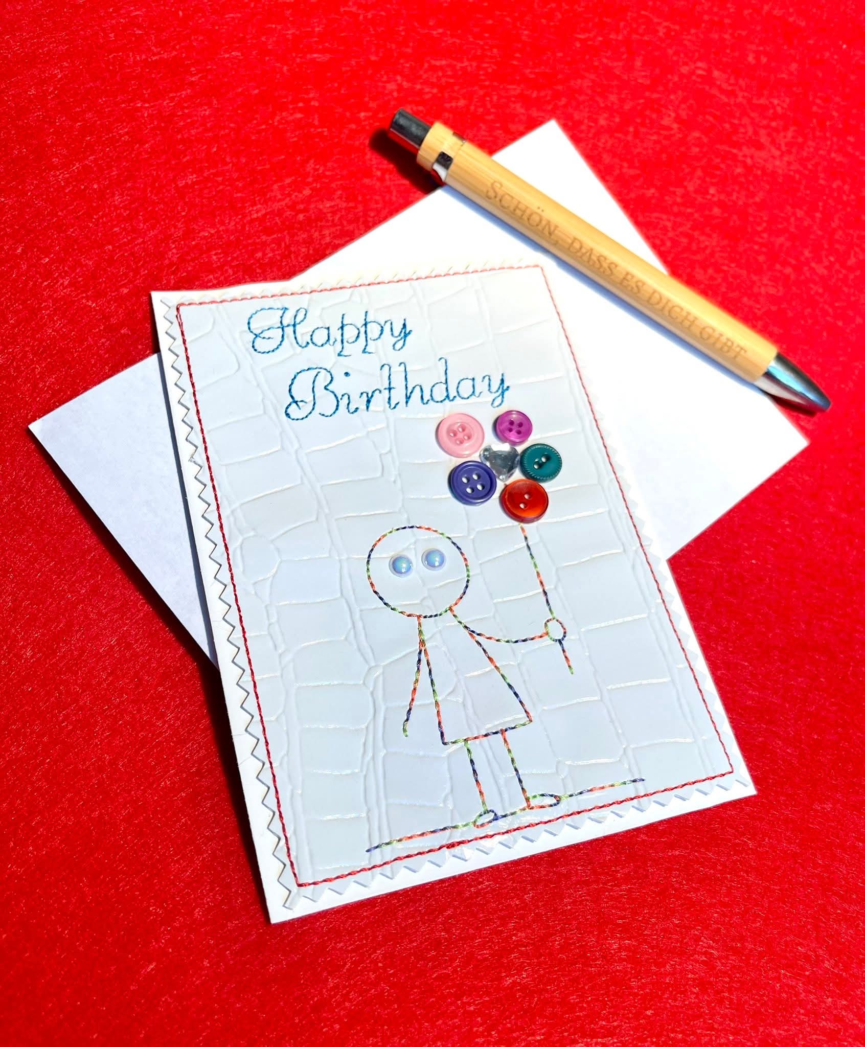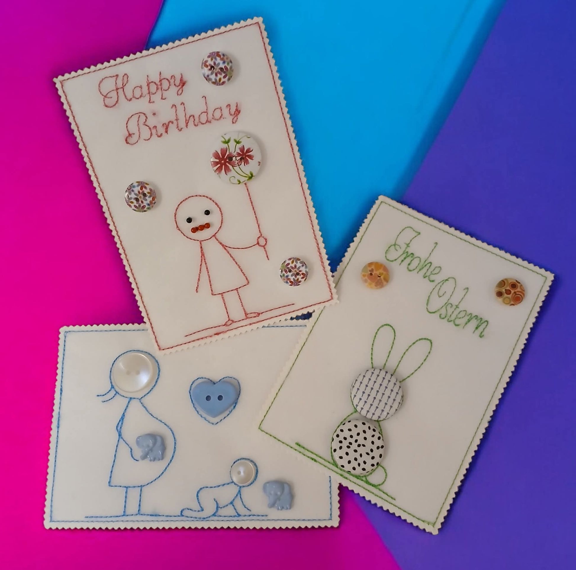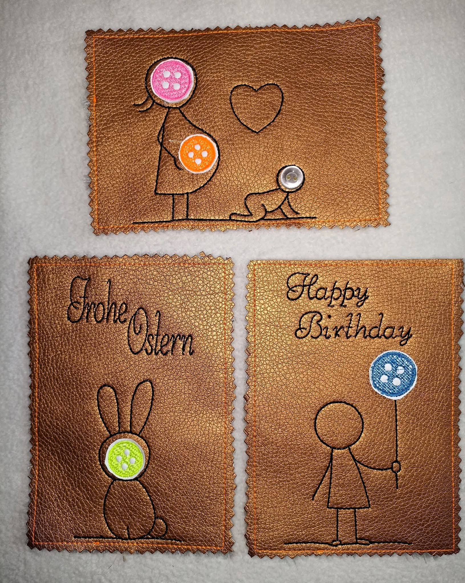Ein KnopfKarten Set bekommt ihr hier. 3 Motive in je zwei Größen. 9x14 und 10x16. Einfach sticken und dann aufkleben. Individuell mit Knöpfen gestalten. Fertig.